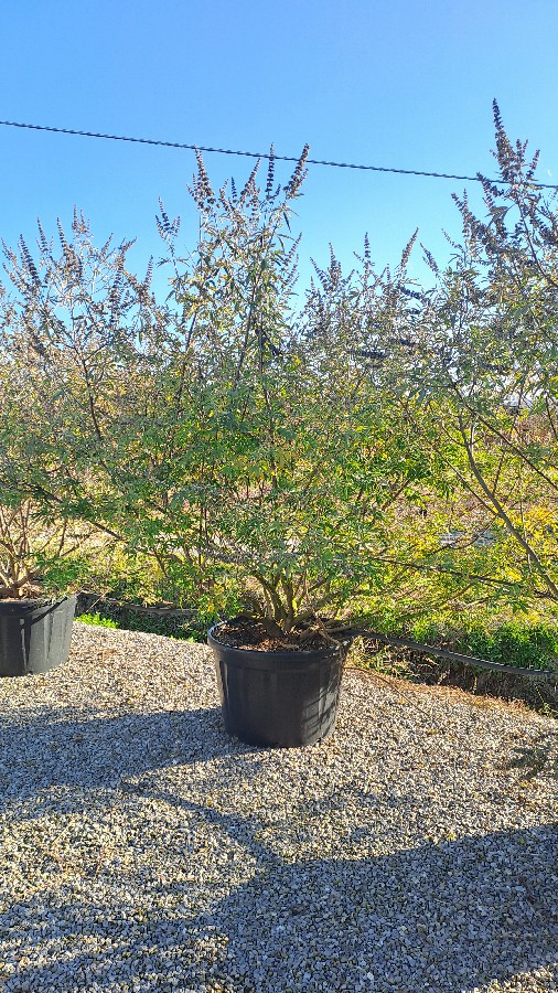 Vitex agnus-castus, commonly known as Chaste Tree, is a deciduous shrub or small tree valued for its late-summer flowering period. This specimen, supplied in a 230L container with a height of 200-250 cm, features a multi-stemmed or shrubby habit characterized by palmate, aromatic foliage and upright panicles of lavender-blue blooms. It serves as a reliable focal point in drought-tolerant schemes or Mediterranean-style planting designs.